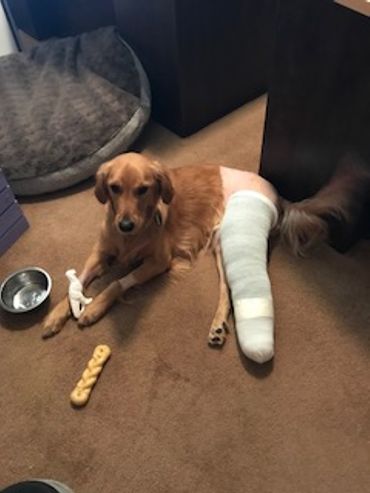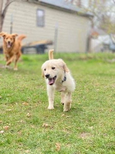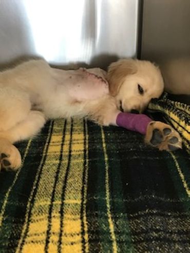 Meet Mighty, now affectionately known as Cooper. He came to us with a birth defect. When he was born part of his right front leg was non-functional. Shortly after birth, he lost that part and ended up with a non-functioning partial limb that limited his activities. After discussing the options for this fearless pup with our veterinarian and orthopedic surgeon, we decided it was best to amputate the limb. He now gets around just like any other puppy, zoomies and all. He is now in his loving home of a previous adopter and is the sweetest, happiest Golden ever! We thank Michelle and her family for giving him a forever home. Welcome home, Cooper!